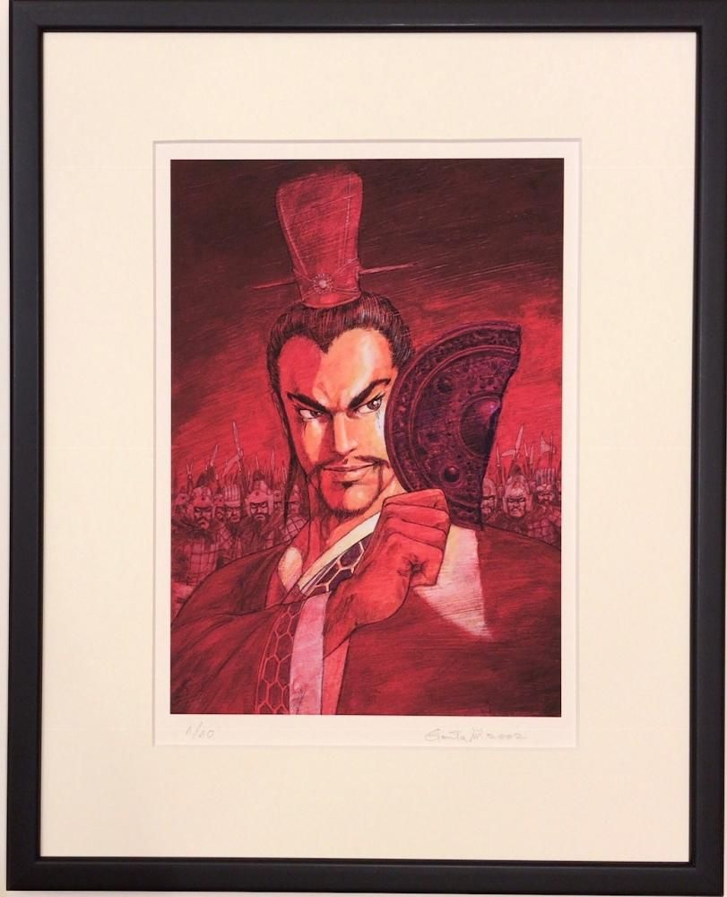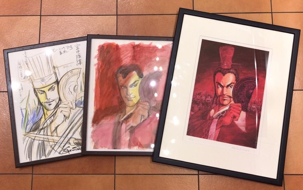 王欣太STUDIOのTwitter上で人気の「これがこうなってこうじゃ!」を再現してみました。ラフ画、着彩プラン画、版画の3枚セットです。版画は高画質ジクレー版画で、2002年の個展でリリースされたうちの1図柄、陰謀がテーマの 『銅鏡をかざす曹操』 エディション1/10です。個展の記録にF氏が1枚だけ所蔵していたものを 欣太先生の命により その再現のために出品。フレームも当時のもので、もちろんコンデイション良好です。