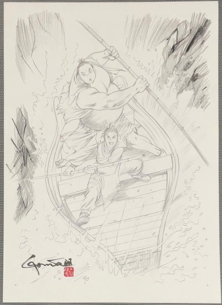 初めての週刊連載『蒼天航路』をアシスタント無しで始めた欣太先生。最初の数話は、時間短縮かつタッチを模索しようと、鉛筆で描いたものをコピーして原稿に仕上げていたそうです。しかし、意外に時間がかかったので途中でやめた... とのこと。その貴重なゼロ原画 (原稿前原画)、"その五・再開" の扉です。