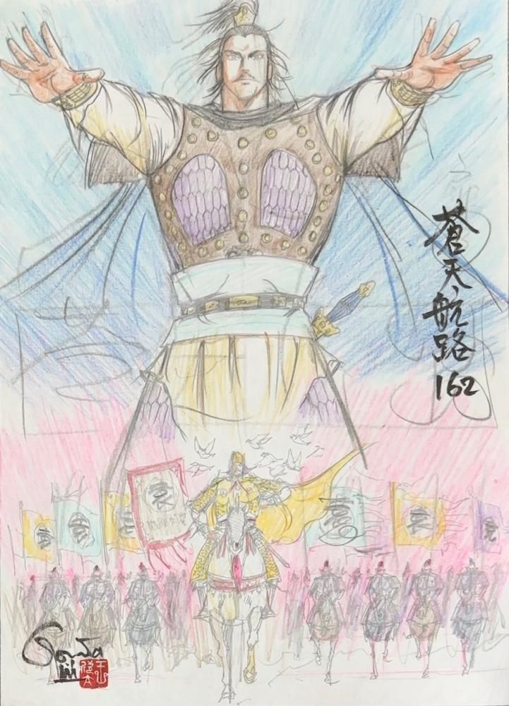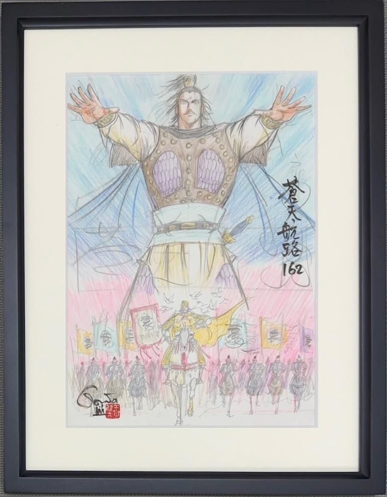 GONTA MECCAが選んだ、蒼天航路のネーム「その162/ 死に易きもの 扉」に、欣太先生が"画"と思えるレベルまで加筆して仕上げたネーム画、GONTA MECCAプロデュースの一点ものです。色鉛筆を多く加えた画をマットにセッティングしてフレーミングいたしました。欣太先生直筆のサイン・落款入り。