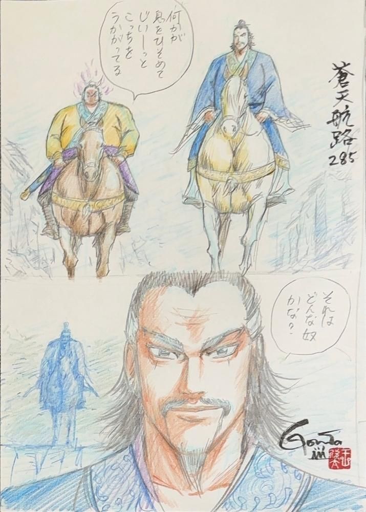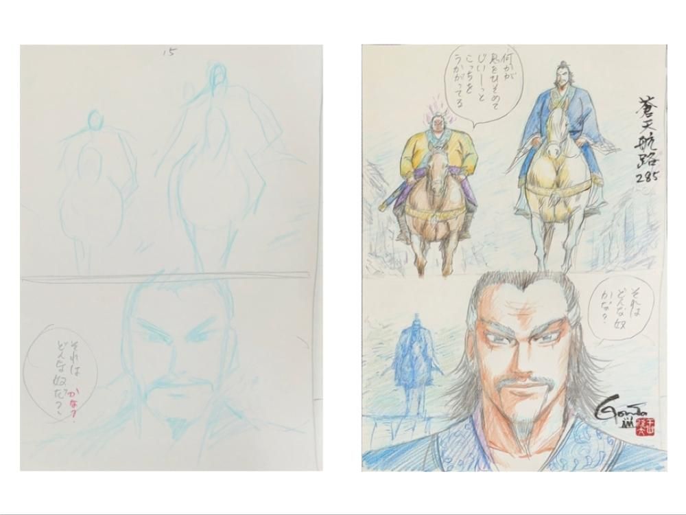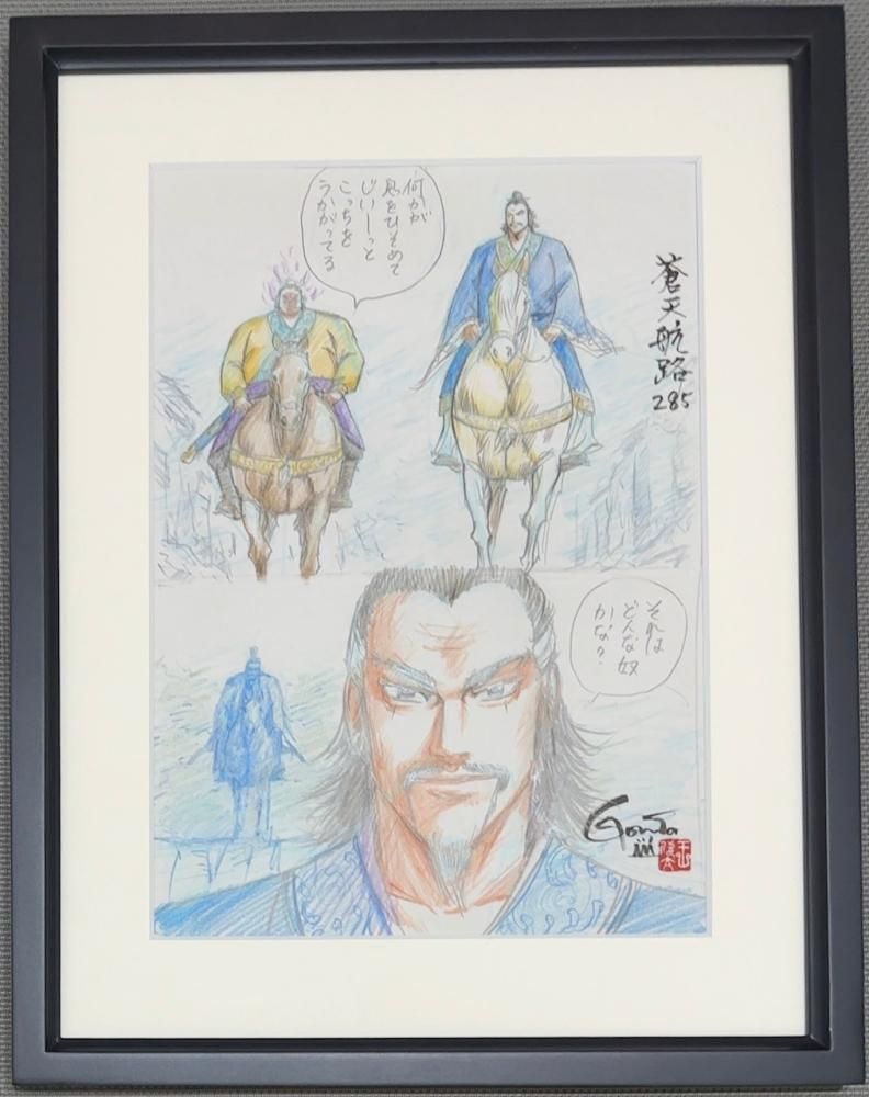 GONTA MECCAが選んだ、蒼天航路のネーム「その285/ 気高き眼光 P.15」に、欣太先生が"画"と思えるレベルまで加筆して仕上げたネーム画、GONTA MECCAプロデュースの一点ものです。色鉛筆を多く加えた画をマットにセッティングしてフレーミングいたしました。欣太先生直筆のサイン・落款入り。