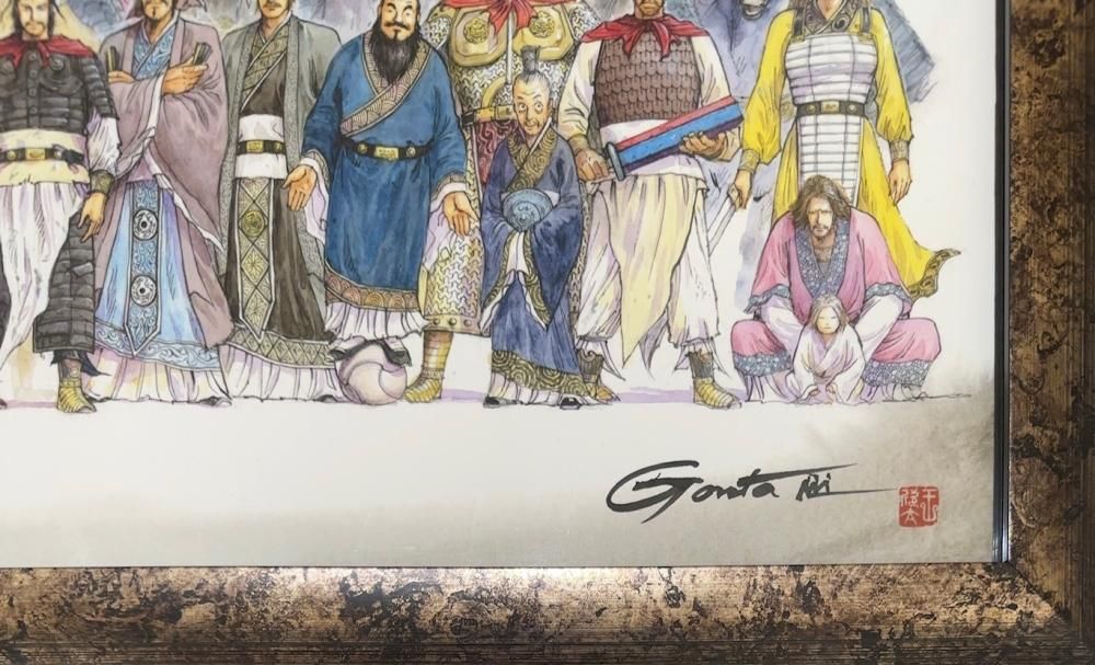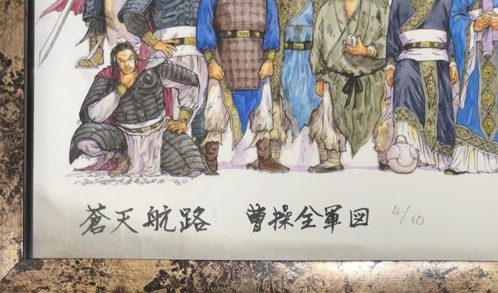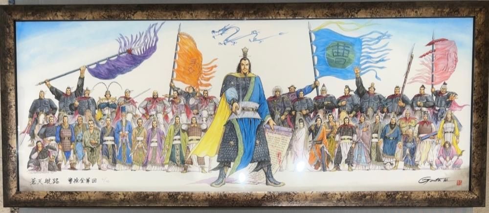 当社のオーナーが発売当時個人的に購入した作品 (既に当ネットショップではsold out) 等々を販売するクオーレ・プライベートコレクションの最初は、GONTA MECCA誕生のきっかけとなった『蒼天航路 曹操全軍図』です。2017年4月19日にリリースされた高品質ジクレー版画のエディション4/10。色調、サイズ、使用フレーム全て、2006年制作の水彩原画と同じに仕上げてあり、圧巻の迫力、非常に見応えあります。作家手書きのタイトル、エディション、サイン、シンボル「蒼龍」と落款が入っており、作家手書きの認証サインとエディションが入った保証書/ CERTIFICATE OF AUTHENTICITYが付きます。