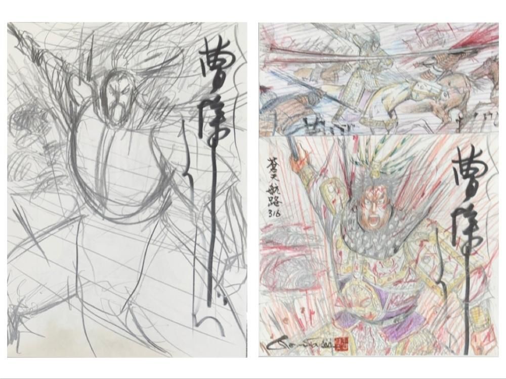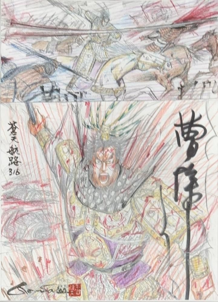 GONTA MECCAが選んだ、蒼天航路のネーム「その316/ 鬼才の本領 P.20」に、欣太先生が"画"と思えるレベルまで加筆して仕上げたネーム画、GONTA MECCAプロデュースの一点ものです。音楽のRemixを思わせる、味わい深いコラージュが施されています。色鉛筆を多く加えた画をマットにセッティングしてフレーミングいたしました。欣太先生直筆のサイン・落款入り。