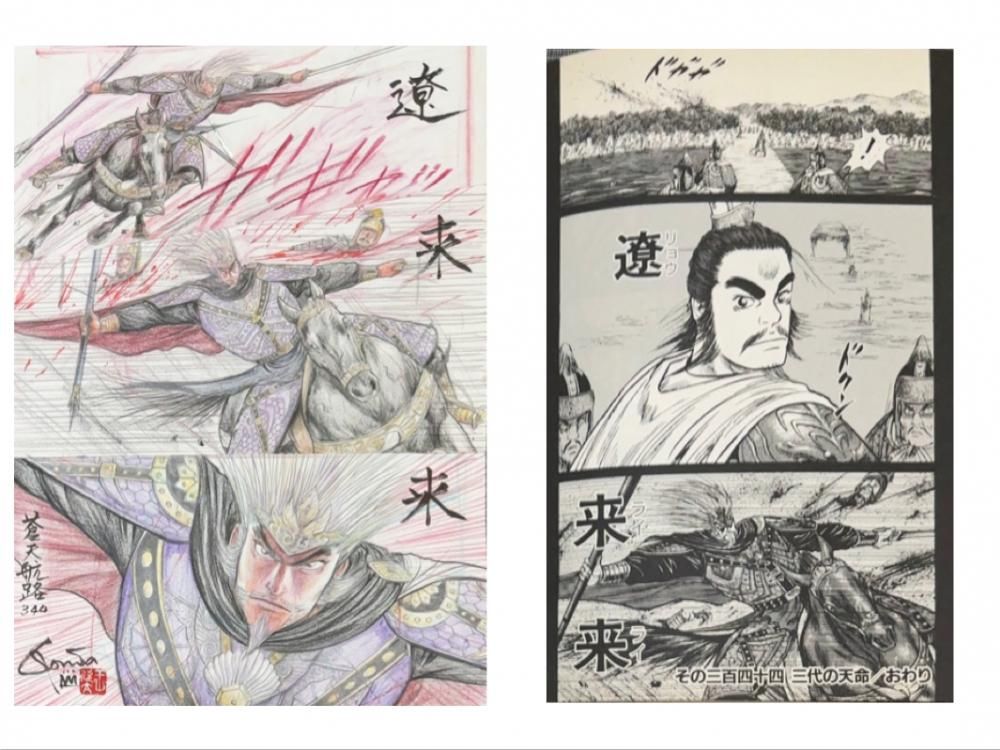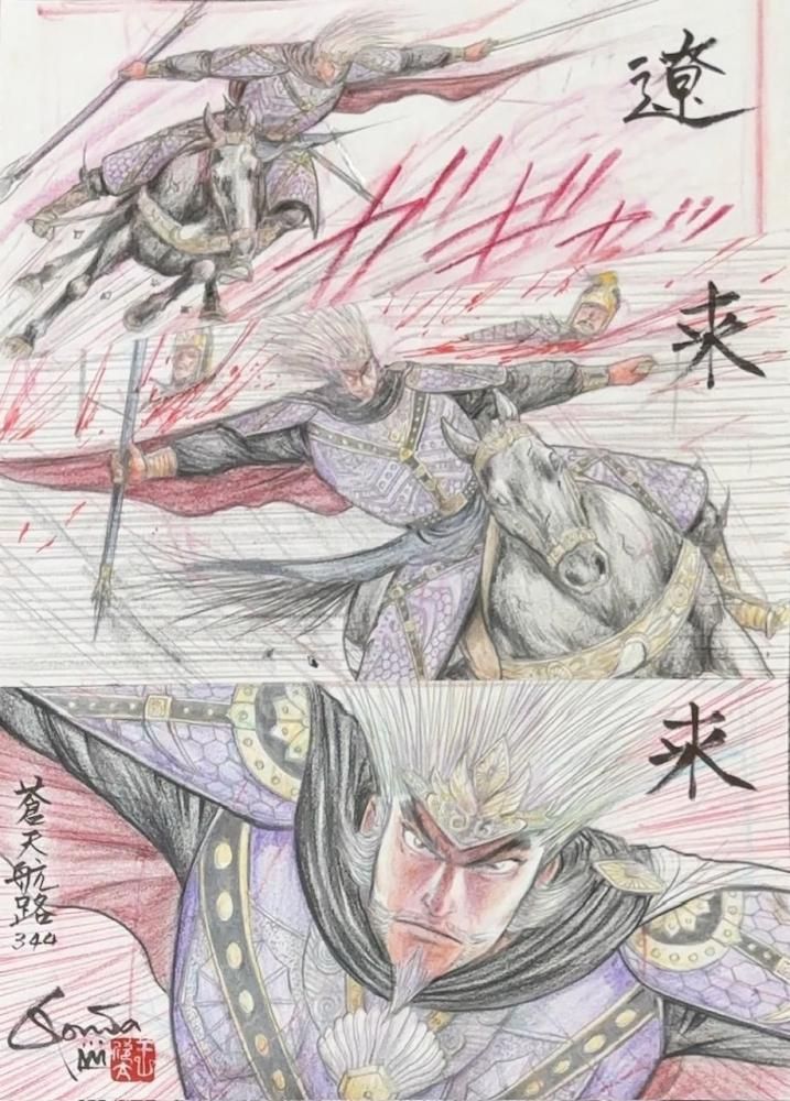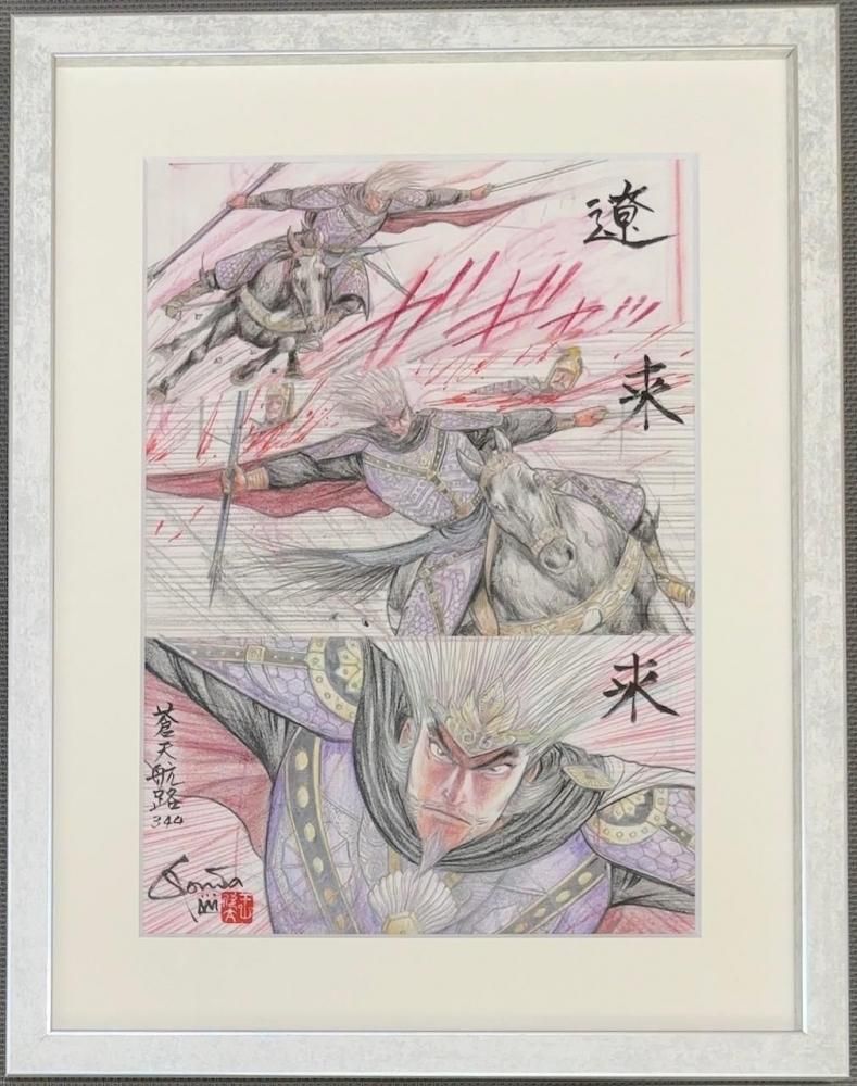 欣太先生が選んだ、蒼天航路のネーム「その344/ 三代の天命 P.20, 5」に、欣太先生が"画"と思えるレベルまで加筆して仕上げたネーム画、GONTA MECCAプロデュースの一点ものです。色鉛筆を多く加えた画をマットにセッティングしてフレーミングいたしました。欣太先生直筆のサイン・落款入り。写真3枚目の左が加筆後のネーム画、右が同頁の原稿です。
