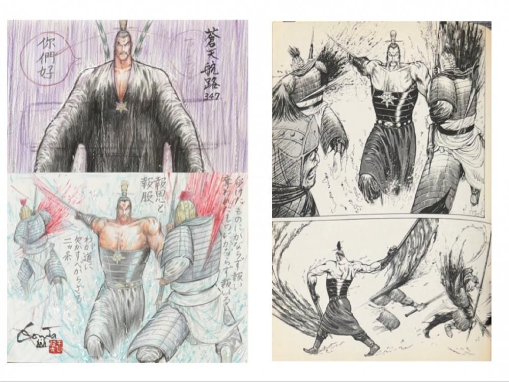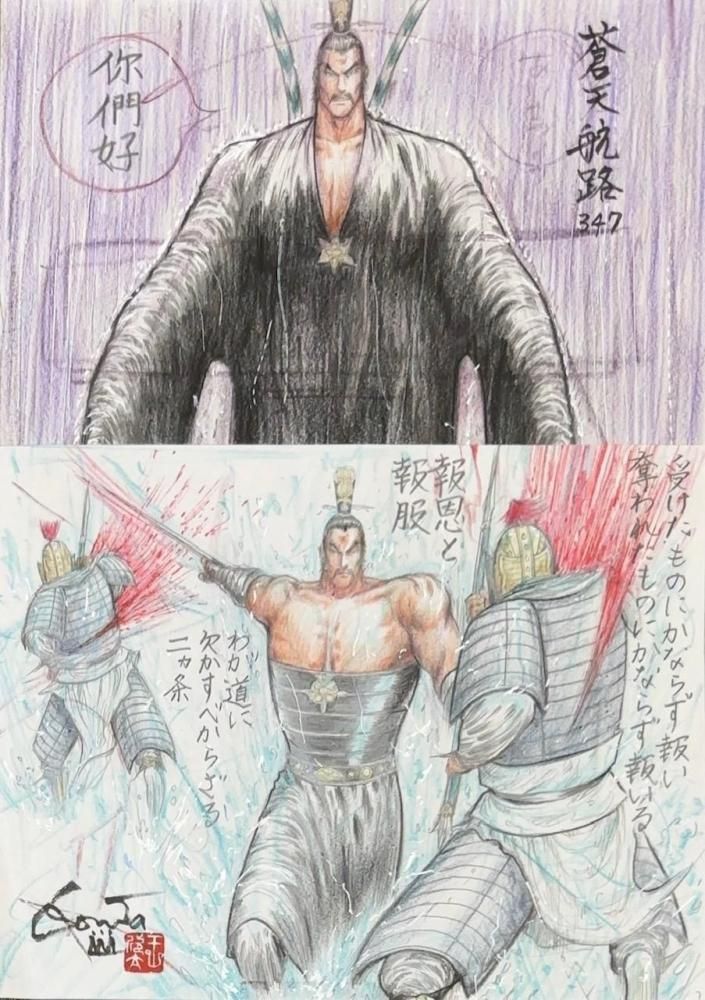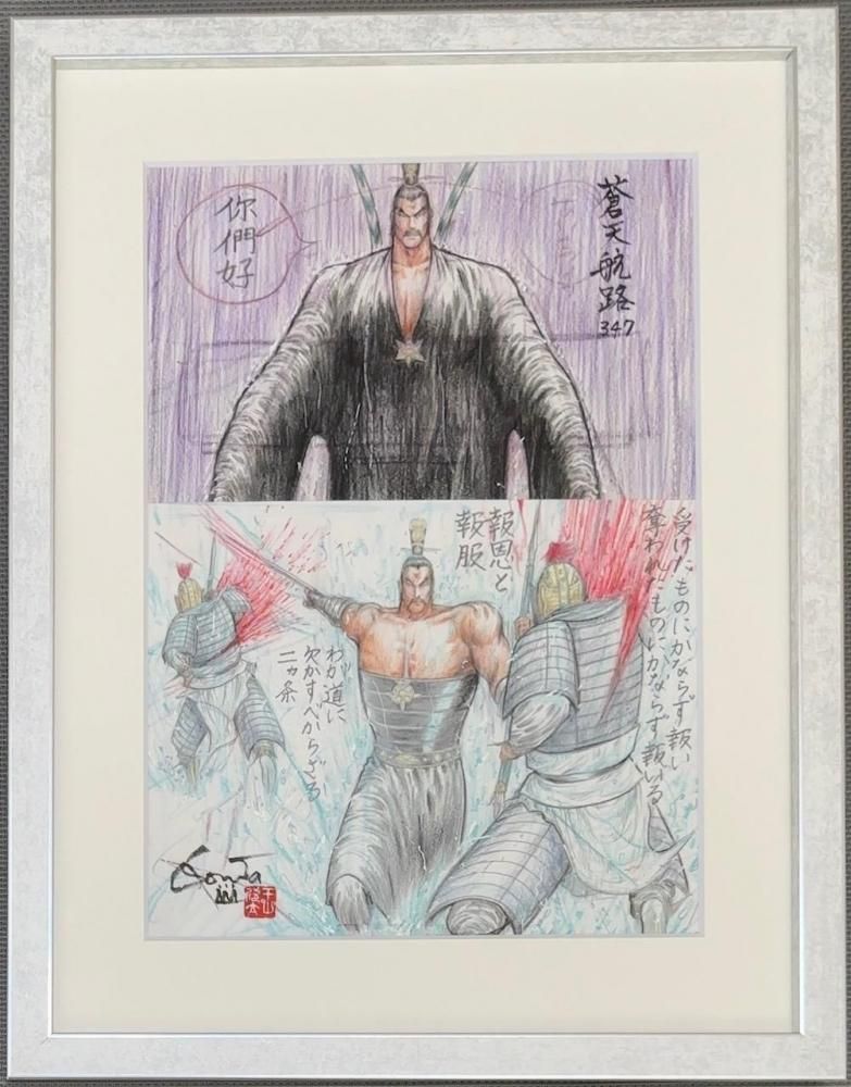 欣太先生が選んだ、蒼天航路のネーム「その347/ 奇襲には奇襲を! P.7, 1」に、欣太先生が"画"と思えるレベルまで加筆して仕上げたネーム画、GONTA MECCAプロデュースの一点ものです。色鉛筆を多く加えた画をマットにセッティングしてフレーミングいたしました。欣太先生直筆のサイン・落款入り。写真3枚目の左が加筆後のネーム画、右が同頁の原稿です。