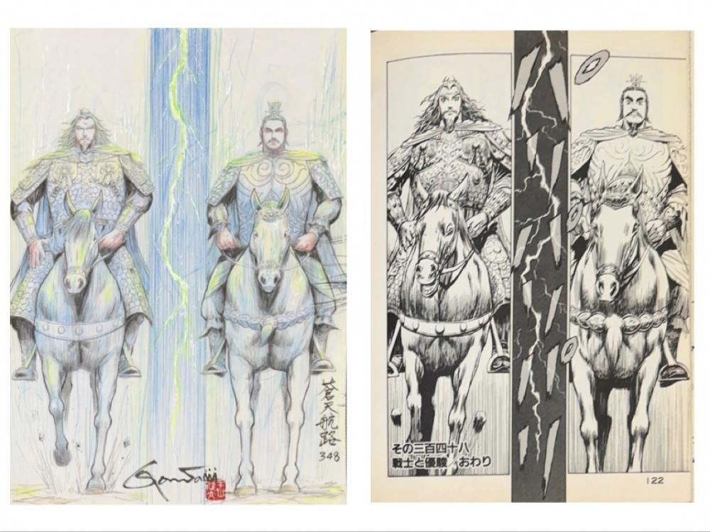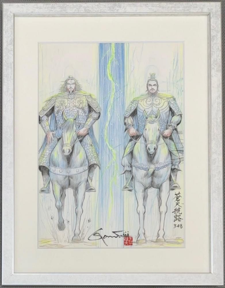 欣太先生が選んだ、蒼天航路のネーム「その348/ 戦士と優駿 P.20」に、欣太先生が"画"と思えるレベルまで加筆して仕上げたネーム画、GONTA MECCAプロデュースの一点ものです。色鉛筆を多く加えた画をマットにセッティングしてフレーミングいたしました。欣太先生直筆のサイン・落款入り。写真3枚目の左が加筆後のネーム画、右が同頁の原稿です。